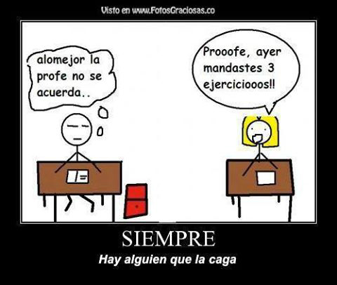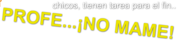 seguramente te paso que era viernes y de mamon a tu Profe/Profesora se le ocurrio dejarles mucha tarea o les quiso poner mas trabajo aun sabiendo que estaban hasta la maadreeee de tareas!! En ese momento simplemente le querias decir PROFEEE..NO MAMEEEEEEE!!!! por eso dedicamos esta pagina para que nos cuentes cuales son las ocurrencias de sus maestros y te entrengas leyendo que dicen otros chavos, asi como tambien podras reirte con nuestros chistes imagenes entre muchas otras cosas!